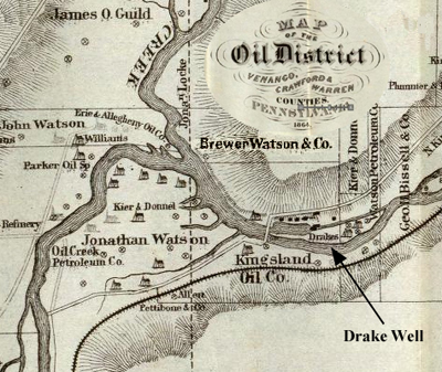 George Bissell’s interest in Pennsylvania oil seeps led to the first U.S. commercial well drilled at Oil Creek (arrow). Original circa 1865 map courtesy David Rumsey Map Collection.