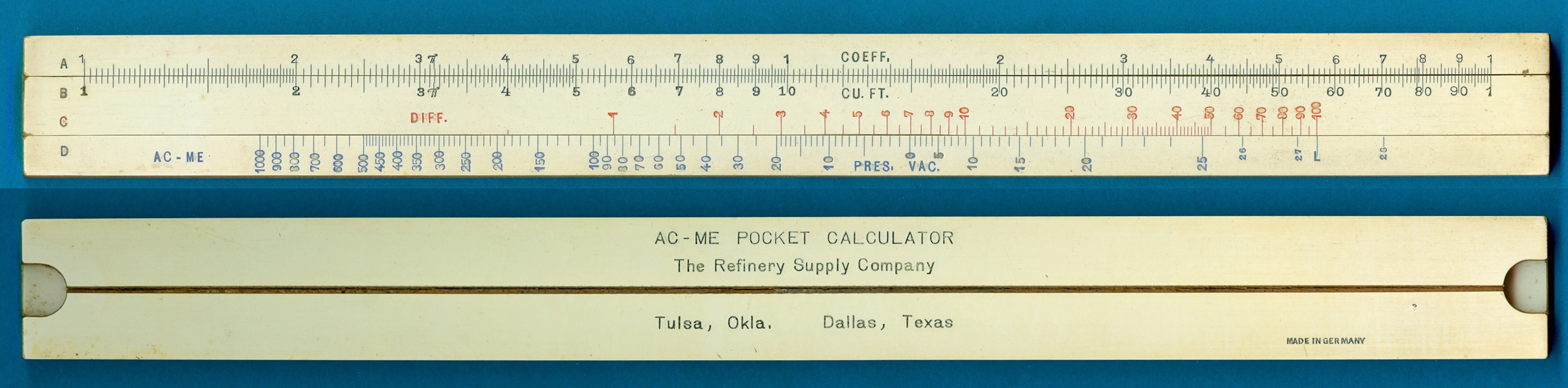Refinery Supply Company of Tulsa was established in 1923, his research found, but there has been little more information about the company’s slide rule. “Can the AOGHS help? From your archives or anyone associated with society, can you tell me anything about this AC-ME pocket calculator, the Refinery Supply Company or the AC-CURATE ME-ASUREMENT PRECISION INSTRUMENTS Company?