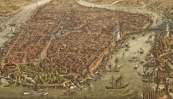 Competing New York City manufactured gas companies provided lighting beginning in 1823. This 1873 “bird’s eye view” illustrates New York and Brooklyn. The Brooklyn Bridge, under construction from 1870 to 1883, is at right. Image courtesy Library of Congress.