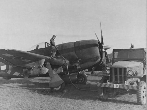 A Republic P-47 in Italy is fueled in this February 1945 photograph “passed for publication” by Allied field press censors. Photo courtesy of the Library of Congress.