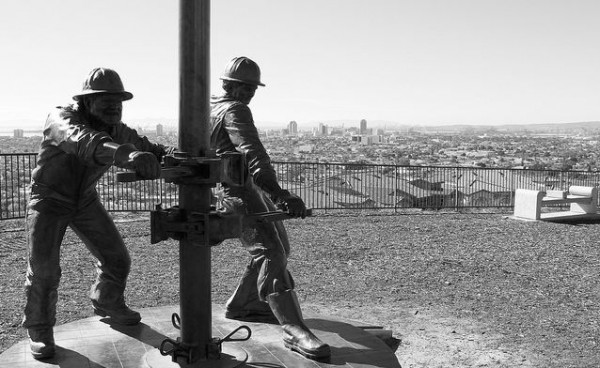 Signal Hill once had so many derricks people called it Porcupine Hill. The city of Long Beach is visible in the distance from the “Tribute to the Roughnecks” statue by Cindy Jackson.