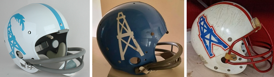 Houston Oilers helmet logos included a gusher (used only in advertising), the inaugural white derrick (1960-1965), and a multicolor variation (1966-1998) until the franchise moved to Nashville. Photographs courtesy Helmet Hut and eBay.