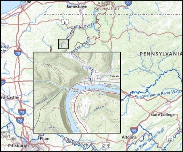 Tidioute experienced a drilling boom soon after the August 1859 oil discovery at nearby Titusville. An 1866 well at Triumph Hill sparked still more Allegheny exploration. Topographic maps courtesy USGS.