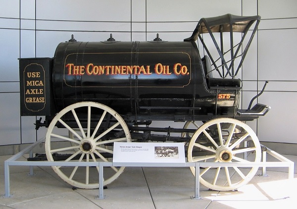An 1880s Continental Oil Company horse-drawn tank wagon welcomes visitors to the Conoco Museum in Ponca City, Oklahoma. Photo by Bruce Wells.