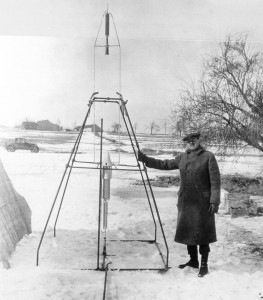 The father of American rocketry, Robert Goddard, in 1926 used gasoline to fuel the world’s first liquid-fuel rocket, seen here in its launch stand. Photo courtesy Library of Congress.