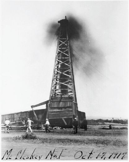 The gusher on cattleman William T. Waggoner’s lease produced about 650 barrels per day from 1,628 feet. Hundreds of producing wells would follow, reaching the oilfield’s peak production of more than eight million barrels in 1913. The Wichita County town is named after Waggoner’s daughter.