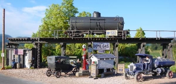 A model railroad enthusiast’s scale model of petroleum technologies in action, details recreated from the Library of Congress photo of the Dome Gas Station at Takoma Park in 1921.