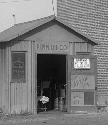 The small “filling station” sold Penn Oil Company’s Lightning Motor Fuel. Four quart of Penn Oil motor oil sold for 80 cents.