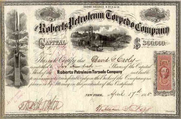 Established in 1865, The Roberts Petroleum Torpedo Company had a lengthy a monopoly on all types of torpedoes used in the petroleum industry. The stock certificate is valued by collectors — scripophily.