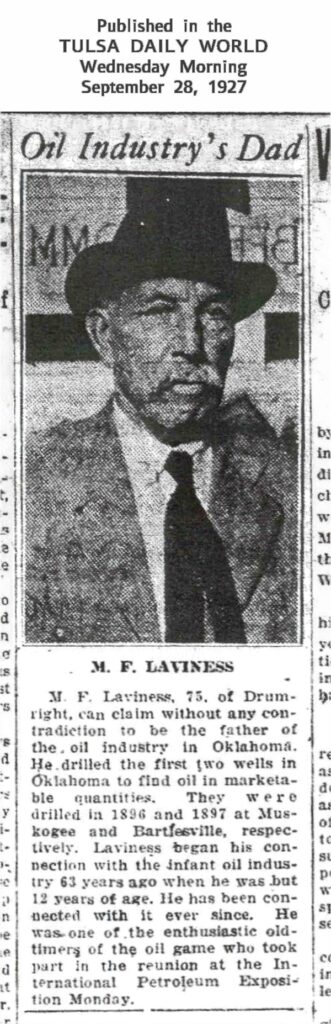 M.F. Laviness, 75, of Drumright, can claim without any contradiction to be the father of the oil industry in Oklahoma. He drilled the first two wells in Oklahoma to find oil in marketable quantities. They were drilled in 1896 and 1897 at Muskogee and Bartlesville, respectively. Laviness began his connection with the infant oil industry 63 years ago when he was but 12 years of age. He has been connected with it ever since.