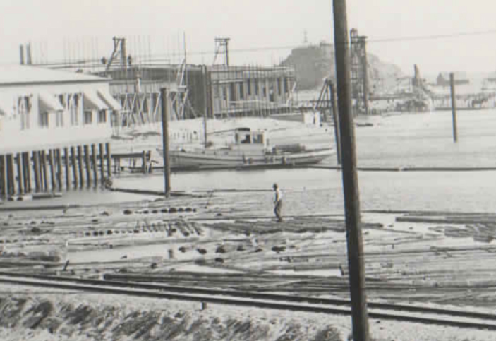 Old and new technologies are seen at the harbor site as well – Nellie Bly’s 55-gallon steel drums and old 42-gallon wooden barrels; the sails and train rails with log drivers (catty men, river rats, river pigs, etc.) corralling floating pilings; and on South Seaside Avenue, the Puente Oil Company – the first to exploit southern California’s Puente Hills’ petroleum resources.