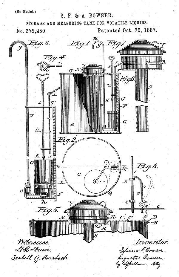 Bowser’s 1887 patent was a pump for “such liquids as kerosene-oil, burning-fluid, and the light combustible products of petroleum.”