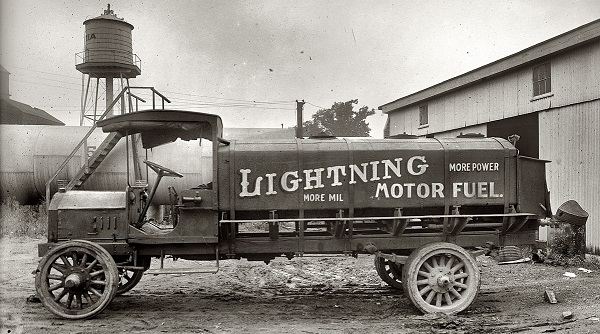 Penn Oil Company filling stations were the exclusive American distributor of Lightning Motor Fuel, a British product made up of “50 percent gasoline and 50 percent of chemicals, the nature of which is secret.” The secret ingredient was likely alcohol. Photo courtesy Library of Congress.