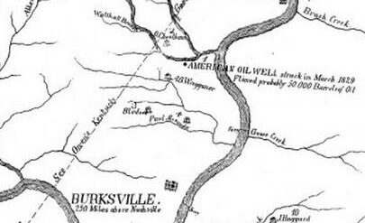 Boring for brine with a simple spring-pole method on a farm near Burksville (today Burkesville), Kentucky,  Martin Beatty found oil at a depth of 171 feet. Disappointed, he searched elsewhere. Beatty drilled brine wells to meet demand from settlers needing salt to preserve food. He bored wells by raising and dropping a chisel suspended from a sapling, an ancient drilling technology.