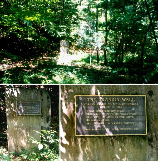 THE GRANDIN WELL — World’s second oil well, commenced August 31st, 1859. It was the First Dry Hole, First Well in Which Tools Stuck; First Well in Which an Explosive Charge Was Used; First Well in Warren County, PA. Erected July 22, 1959, by Oil Centennial Inc.