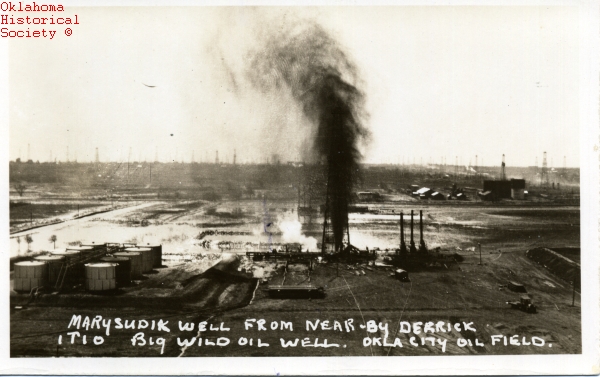 The Mary Sudik No. 1 well erupted after striking a high-pressure formation about 6,500 feet beneath the farm of Vincent and Mary Sudik near the intersection of Bryant Street and present-day I-240 in southwest Oklahoma City. The Indian Territory Illuminating Oil Company’s well flowed a “volcano of crude oil and natural gas” for 11 days before being brought under control.