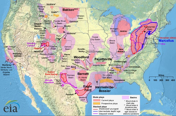 More innovations came as geologists recognized the potential of natural gas-rich shales in Arkansas (Fayetteville formation) and in Pennsylvania and nearby states (the Marcellus). In the Williston Basin of North Dakota, producing oil since 1951, billions of barrels of new production came from the Bakken shale (see First North Dakota Oil Well).