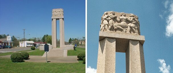 The 20-ton sculptured block of Texas granite — supported by two monolithic granite columns — depicts 12 life-size figures to represent children coming to school, bringing gifts and handing in homework to two teachers.