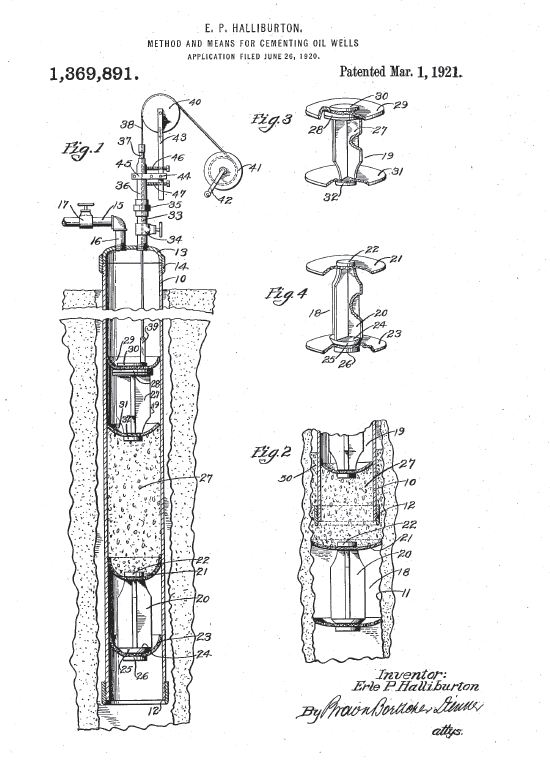 “It is well known to those skilled in the art of oil well drilling that one of the greatest obstacles to successful development of oil-bearing sands has been the encountering of liquid mud water and the like during and after the process of drilling the wells,” Halliburton noted in his June 1920 patent application.