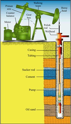 Key to pumping the oil (and often set to run on a timer), an engine turns gears that move a counterweight connected to the walking beam, which moves the sucker rod up and down to up draw oil.