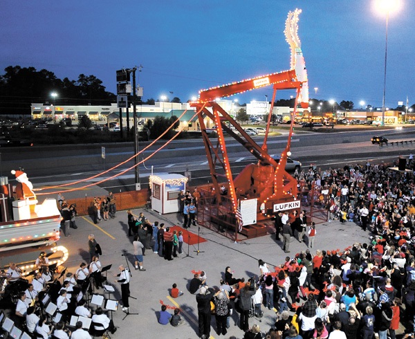 The lighting of “Rudolph the Red Nosed Pumping Unit” in 1966 became an annual event at Lufkin, Texas. More than 1,000 lights were added to a fully operational, 45-foot-tall pumpjack. Photo courtesy the Lufkin Daily News.